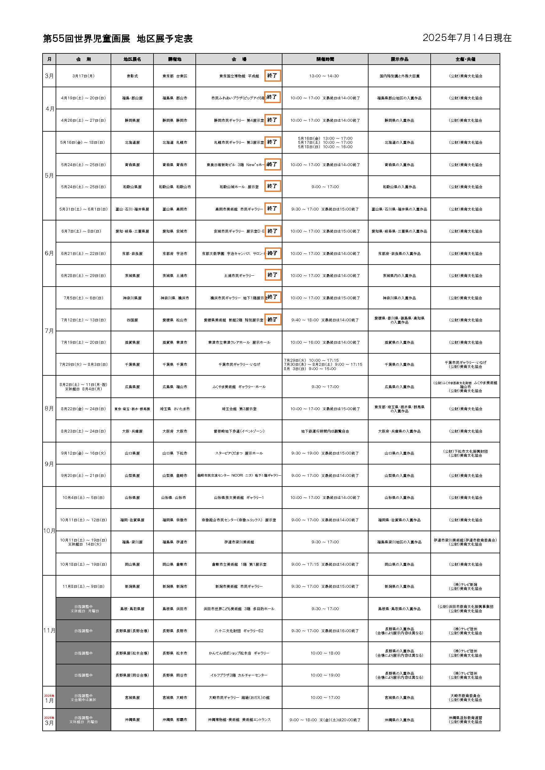 2025年7月17日 / 最終更新日時 : 2025年7月18日 美育文化協会 お知らせ Topics 第55回世界児童画展「地区展」開催予定表を更新いたしました。 新潟県展の「開催時間」を更新 ※最終日は15:00終了→※最終日は14:00終了 ●PDFデータで見る。