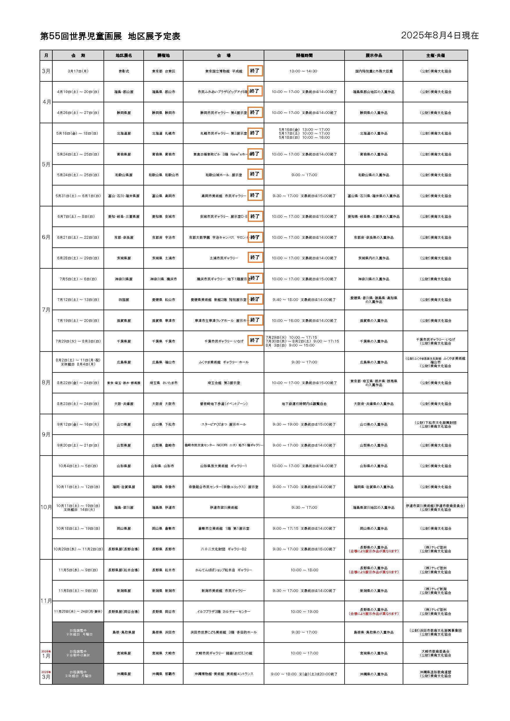 2025年8月4日 / 最終更新日時 : 2025年8月4日 美育文化協会 お知らせ Topics 第55回世界児童画展「地区展」開催予定表を更新いたしました。 ・千葉県展が終了しました。・長野県展(長野、松本、岡谷会場)の会期が決定しました。 ●PDFデータで見る。