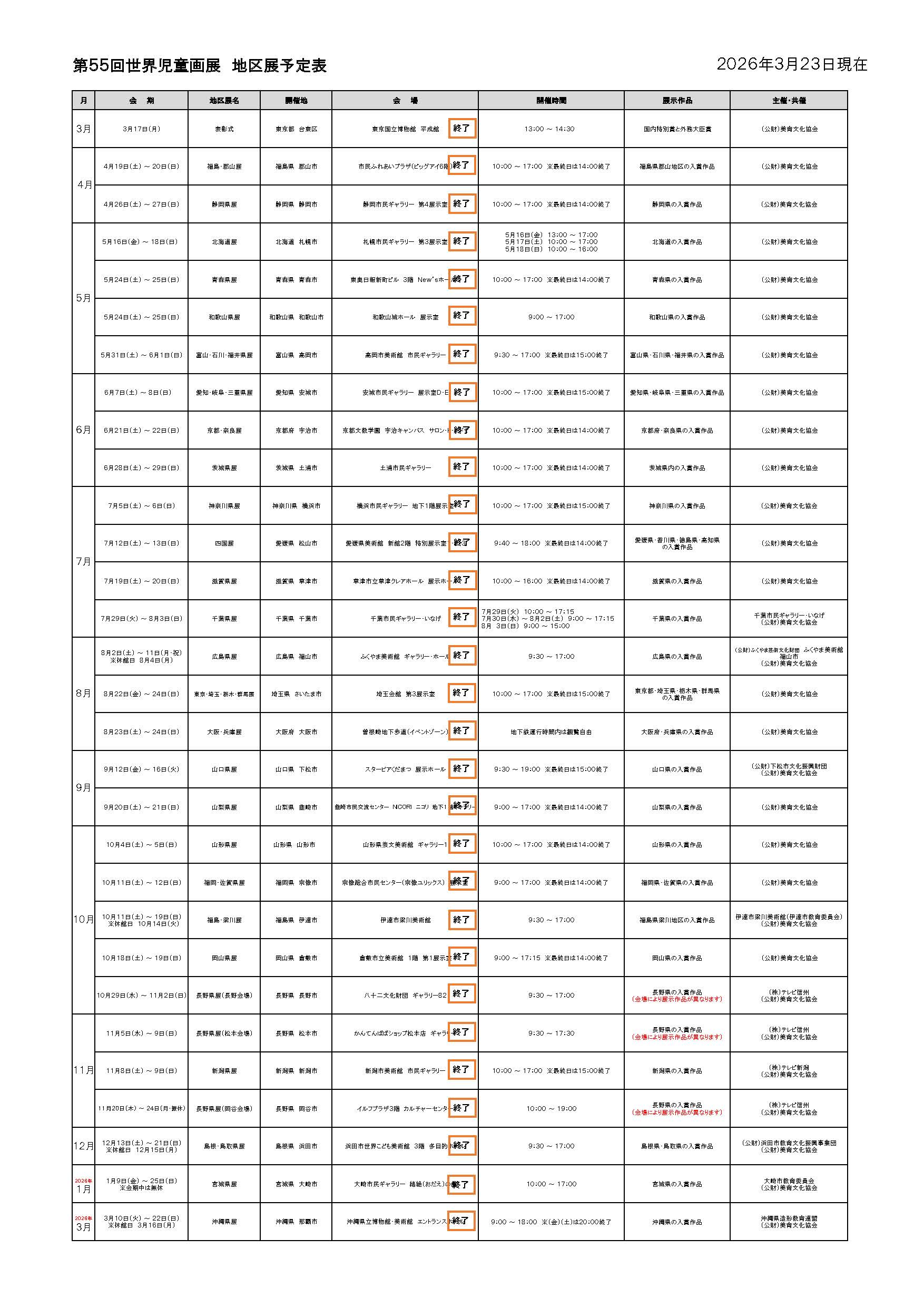 2026年3月23日 / 最終更新日時 : 2026年3月23日 美育文化協会 お知らせ Topics 第55回世界児童画展「地区展」開催予定表を更新いたしました。 沖縄県展が終了しました。 ●PDFデータで見る。