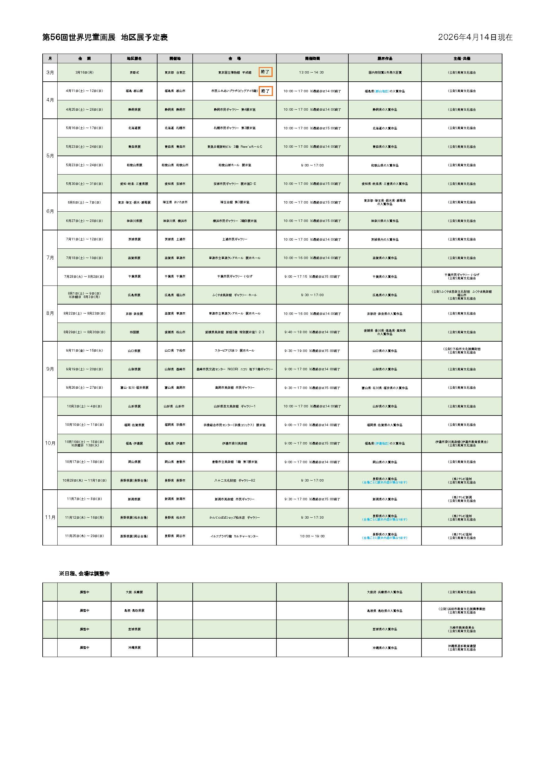 2026年4月14日 / 最終更新日時 : 2026年4月14日 美育文化協会 お知らせ Topics 第56回世界児童画展「地区展」開催予定表を更新いたしました。 ・長野県展(長野会場)の会期が決定しました。・長野県展(松本会場)の会期が決定しました。・長野県展(岡谷会場)の会期が決定しました。 ●PDFデータで見る。