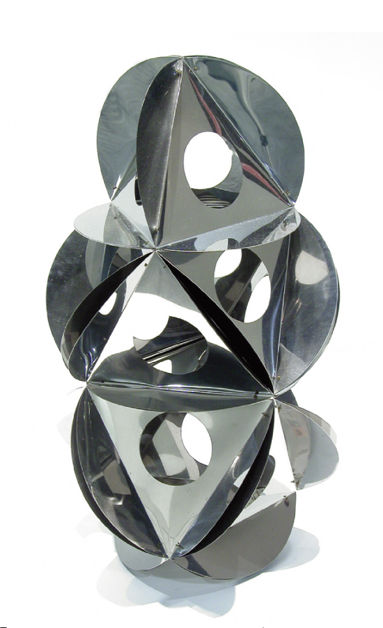 このオブジェは、円形と正三角形の繰り返しでできている作品です。自然の中に見いだされる丸い形と、人間の理知の産物である正三角形を組み合わせ、分子構造のようにできあがっているオブジェです。これは、ムナーリの自然に対する深い洞察と探究によって、繰り返しの形が視覚化されている作品だといえるでしょう。ミラノの「20世紀美術館」には、人体サイズより大きな作品が展示されています。
