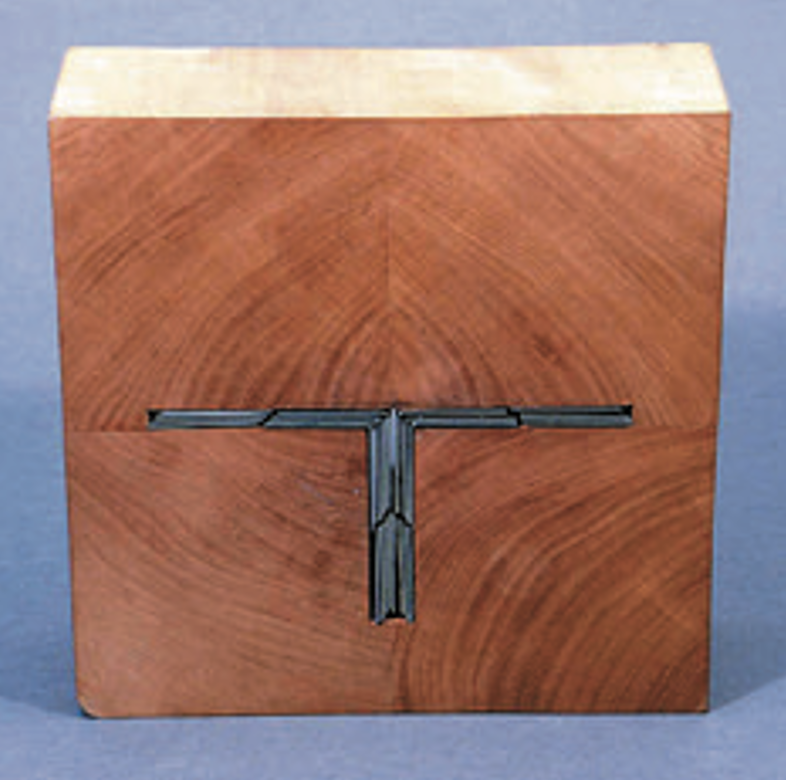 このオブジェは、上下もなく、そして前後もありません。しかし厳然とそれは存在しています。同じ形のユニットを、つなぎ方を変えて組み合わせることで、さまざまな形の空間が生まれます。決まった形があるわけではなく、組み合わせる人によって変化が楽しめる作品なのです。なお、このオブジェには木製の展示用の台座がついています。T字型の切れ込みかあり、L字のユニットを展示しないときは、収納できるようになっています。